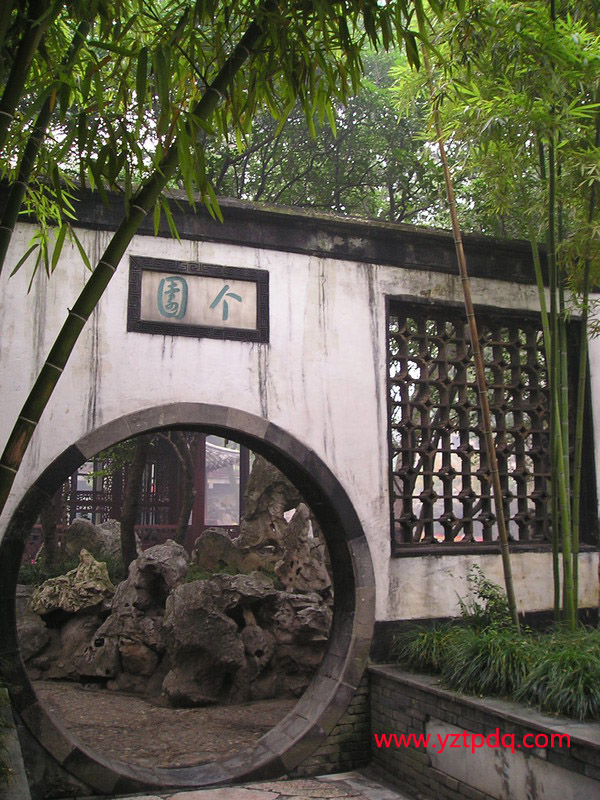 個園是一處典型的私家住宅園林。從住宅進(jìn)入園林,首先映入眼簾的是月洞形園門。門上石額書寫“個園”二字,“個”者,竹葉之形,主人名“至筠”,“筠”亦借指竹,以為名“個園”,點明主題。園門兩側(cè)各種竹子枝葉扶疏,“月映竹成千個字”,與門額相輝映;白果峰穿插其間,如一根根茁壯的春筍。主人以春景作為游園的開篇,想是有“一年之計在于春”的含意吧!透過春景后的園門和兩旁典雅的一排漏窗,又可瞥見園內(nèi)景色,樓臺、花樹映現(xiàn)其間,引人入勝。進(jìn)入園門向西拐,是與春景相接的一大片竹林。竹林茂密、幽深,呈現(xiàn)生機勃勃的春天景象。